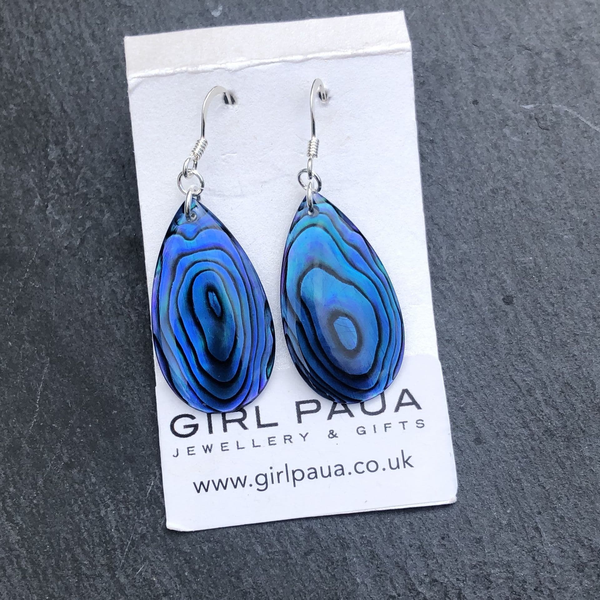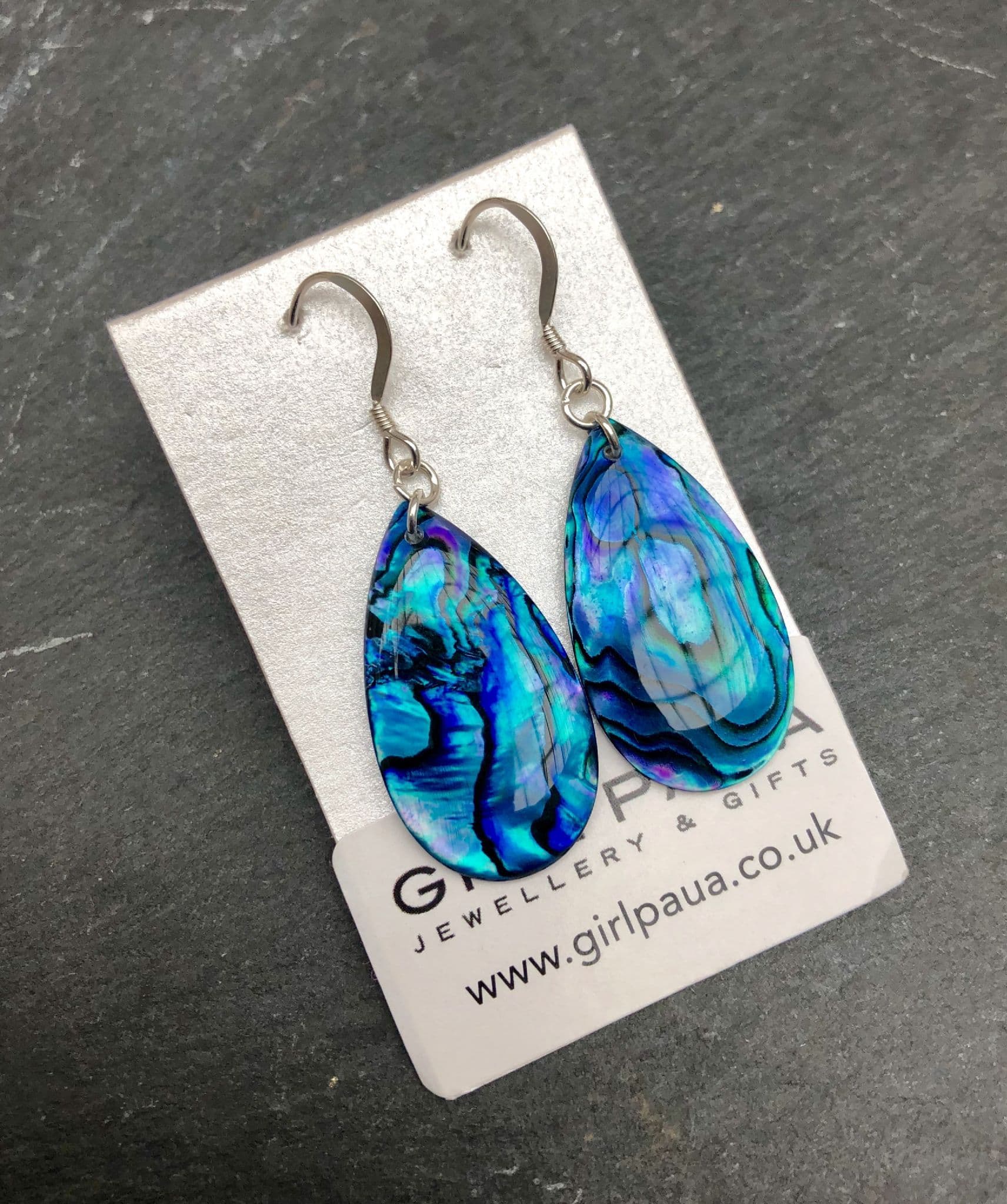Beautiful Paua Shell (New Zealand Abalone) Blue Waterdrop Earrings. Paua is the brightest of all the abalone in the world, with a rainbow of hues which match everything. The Blue Paua Shell measures 30x16mm